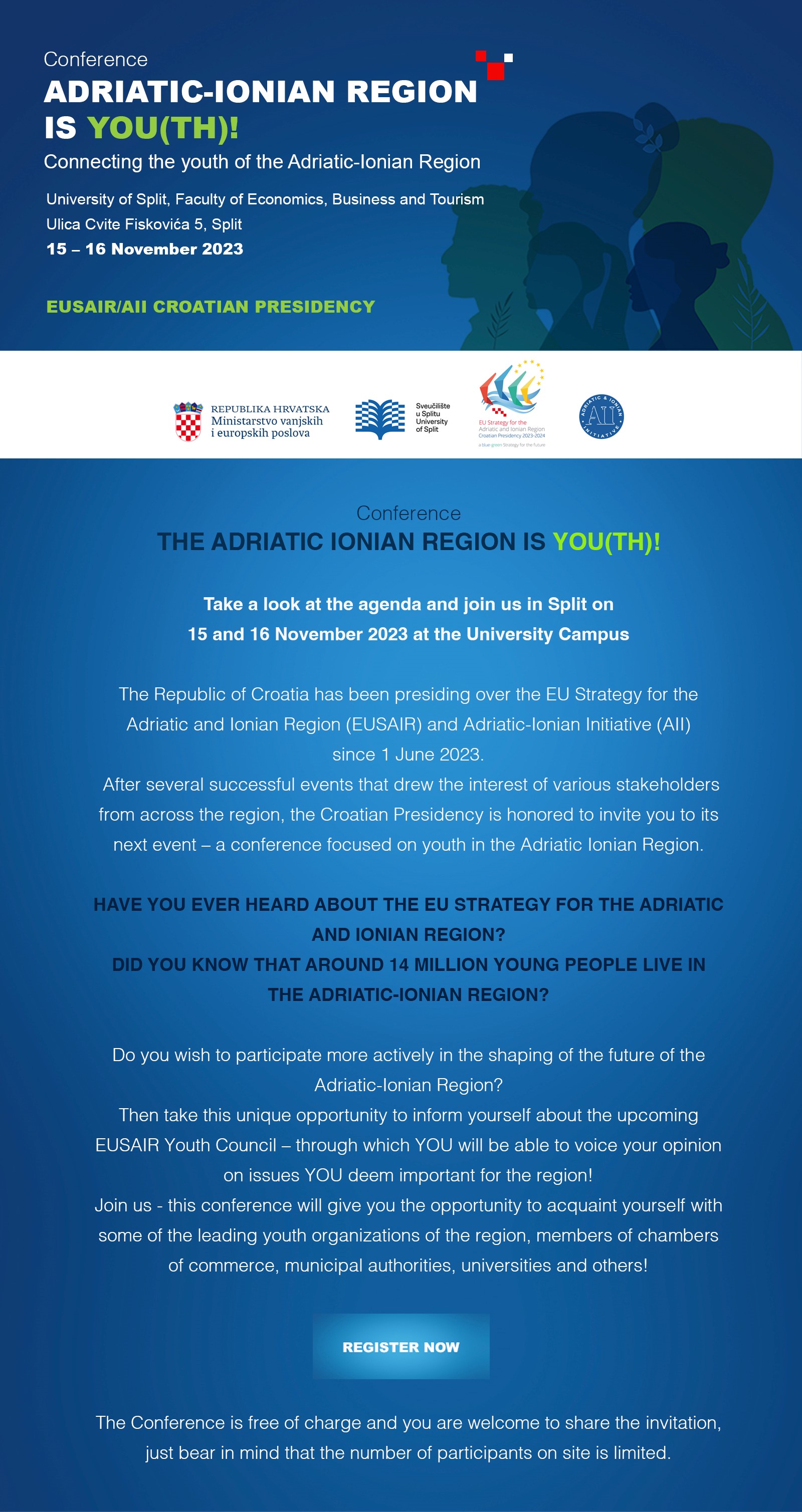 Pozivamo vas na dvodnevnu studentsku konferenciju ADRIATIC-IONIAN REGION IS YOU(TH)! koju Sveučilište u Splitu suorganizira s Ministarstvom vanjskih i europskih poslova u okviru hrvatskog predsjedanja EUSAIR-om.