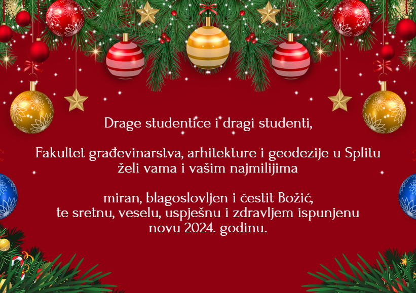 Fakultet građevinarstva, arhitekture i geodezije u Splitu želi vama i vašim najmilijima miran, blagoslovljen i čestit Božić, te sretnu, veselu, uspješnu i zdravljem ispunjenu novu 2024. godinu.