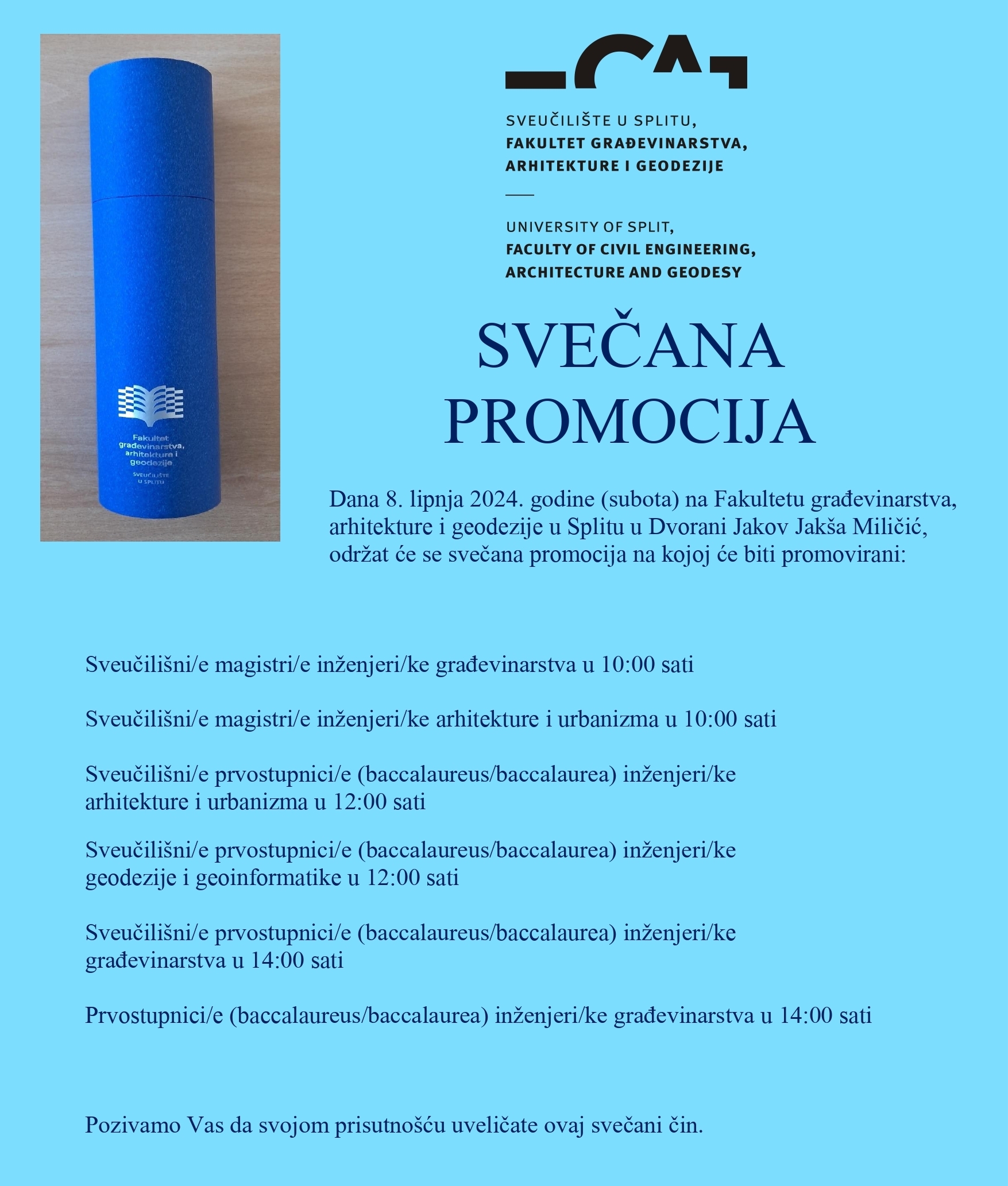Dana 8. lipnja 2024. godine (subota) na Fakultetu građevinarstva, arhitekture i geodezije u Splitu u Dvorani Jakov Jakša Miličić, održat će se svečana promocija na kojoj će biti promovirani:
