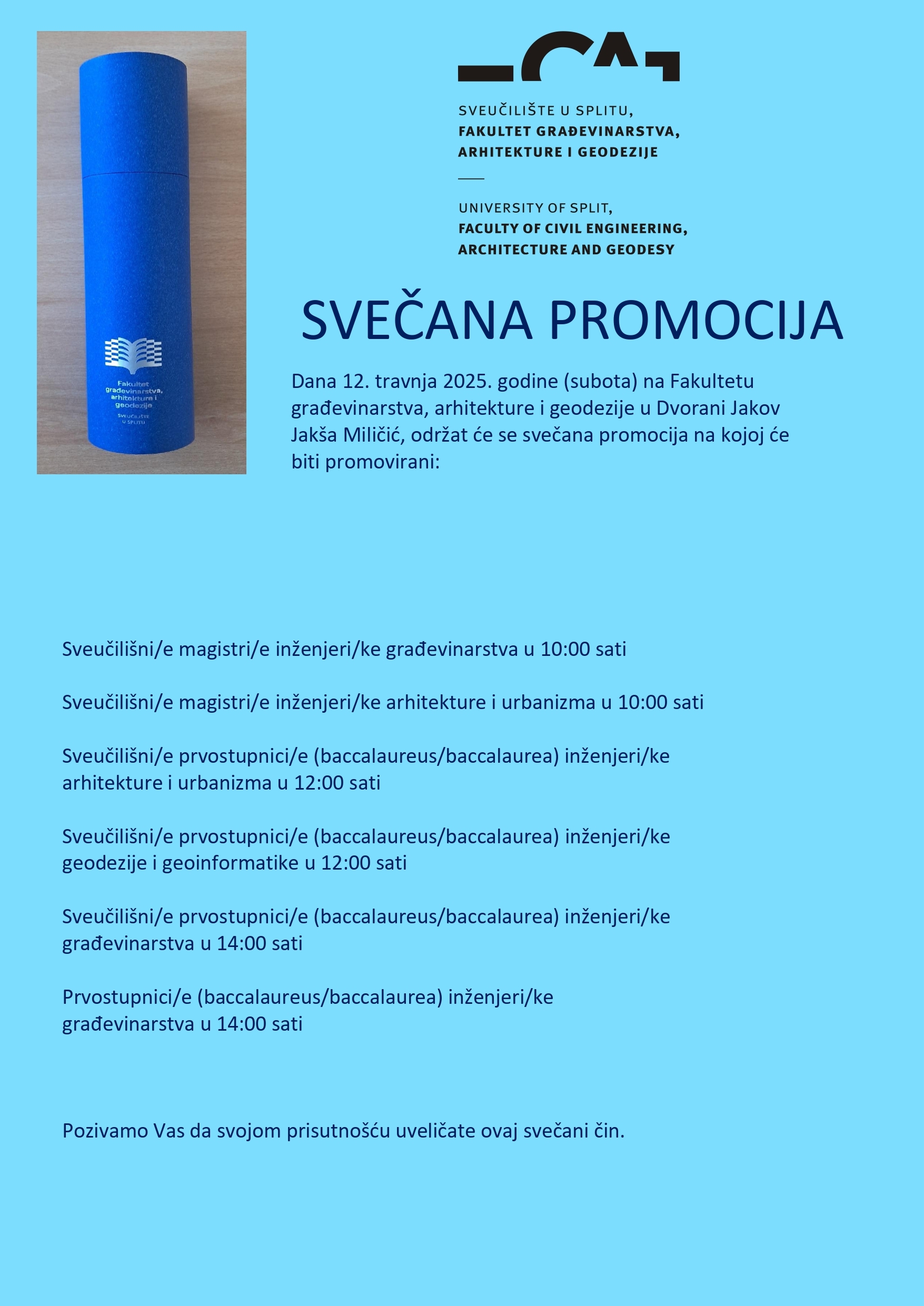 Dana 12. travnja 2025. godine (subota) na Fakultetu građevinarstva, arhitekture i geodezije u Dvorani Jakov Jakša Miličić, održat će se svečana promocija na kojoj će biti promovirani: