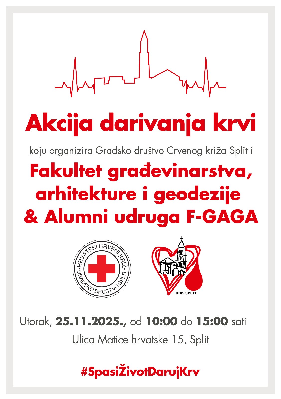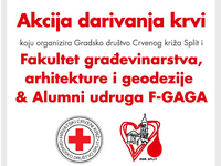 Pozivamo vas na akciju darivanja krvi koju naš Fakultet organizira u suradnji s Udrugom bivših studenata i prijatelja Fakulteta građevinarstva, arhitekture i geodezije u Splitu (F-GAGA) i Gradskim društvom Crvenog križa Split koja će se održati u: