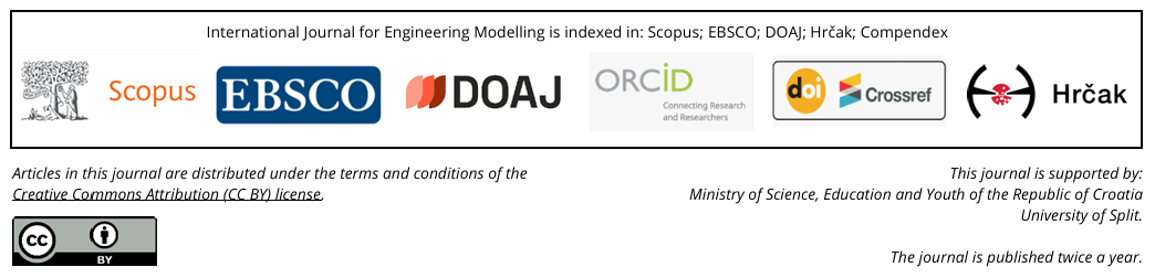 Rights: International Journal for Engineering Modelling is an open-access journal. All content is immediately and freely available to anyone, anywhere. The journal does not charge either article processing charges (APCs) or article submission charges. Users are allowed to read, download, copy, redistribute, print, search, and link to material, and alter, transform, or build upon the material, or use them for any other lawful purpose as long as they attribute the source in an appropriate manner according to the CC BY license. The papers published in the International Journal for Engineering Modelling can be deposited and self-archived in the institutional and thematic repositories providing the link to the journal's web pages and HRČAK. The journal content is archived with a long-term preservation service of National and University Library in Zagreb.
