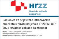 Cilj radionice je pružiti pregled trenutačno otvorenih natječaja Hrvatske zaklade za znanost, s naglaskom na ključne uvjete prijave, kao i ponuditi korisne smjernice i preporuke za pripremu kvalitetnih projektnih prijedloga u okviru natječaja IP i UIP.